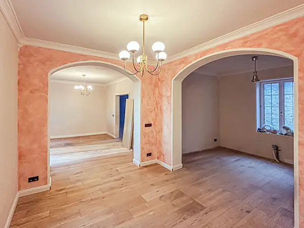 Innenbereich des Jägerhofs auf Rügen im Rohbauzustand mit verputzten Wänden und offenen Rundbögen Sanierter Innenbereich im Jägerhof mit Eichendielenboden, Rundbögen, Wandgestaltung in warmen Farben und Deckenleuchten